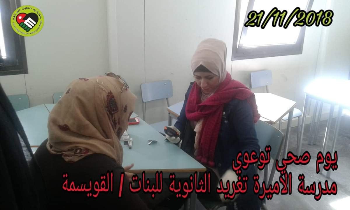 أقامت مدينة الملك عبدالله الثاني الرياضية -امانة عمان الكبرى ضمن مبادرة يلا نتعاون على الخير بالتعاون مع ادارة الدوريات الخارجية - الامن العام يوم توعوي صحي في مدرسة تغريد الثانوية للبنات الاستكشافية 21/11/2018.