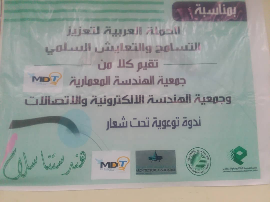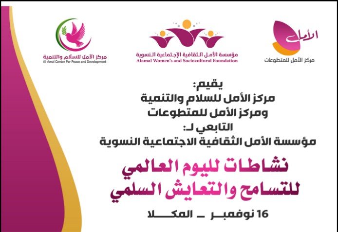 ضمن الحملة العربية للتسامح والتعايش السلمي الذي أطلقها الاتحاد العربي للتطوع وبالتزامن مع اليوم العالمي للتسامح نفد مركزي الامل للسلام والتنمية والامل للمتطوعات التابعي لمؤسسة الامل الثقافية الاجتماعية النسوية صباح الخميس 15 نوفمبر 2018م فعاليات وانشطة اليوم العالمي للتسامح والتعايش السلمي بمدينة المكلا بمحافظة حضرموت.