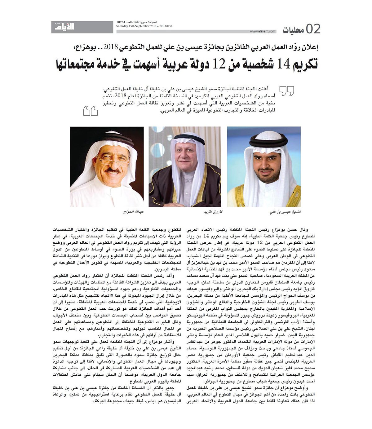 بحضور معالي الشيخ خالد بن عبدالله آل خليفة نائب رئيس مجلس الوزراء وتحت رعاية سمو الشيخ عيسى بن علي بن خليفة آل خليفة رئيس الاتحاد البحريني لكرة السلة الرئيس الفخري لجمعية الكلمة الطيبة اقيم مساء اليوم الاثنين 17 سبتمبر 2018 حفل توزيع جائزة سمو الشيخ عيسى بن علي بن خليفة آل خليفة للعمل التطوعي في نسختها الثامنة.