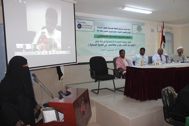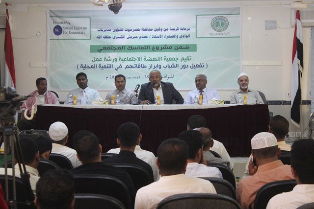 بدأت صباح الأربعاء الموافق 27-12-2017م بمدينة سيئون ورشة عمل لتفعيل دور الشباب وإبراز طاقتهم في التنمية المحلية، التي تقيمها جمعية النهضة الاجتماعية بحضرموت بتمويل من منظمة الصندوق الوطني للديمقراطية (نيد) ضمن مشروع التماسك المجتمعي ..وتتناول الورشة التي تعقد ليومي (الأربعاء والخميس) بقاعة البحوث الزراعية بسيئون محاور في كيفية تفعيل الدور الشبابي لخلق تنمية مجتمعية وإبراز طاقاتهم على المستوى المحلي والعمل على تنميتها وعرض براءات اختراع لأشخاص حضارم ويمنيين حققوا انجازات على المستويات الدولية الخارجية عبر شبكة الإنترنت ..