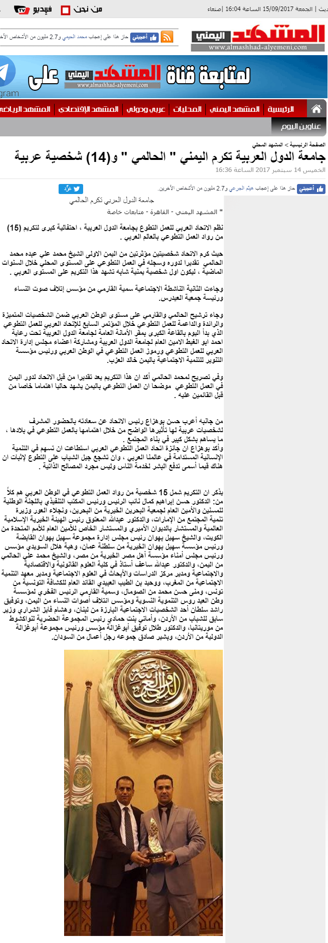 من جهته رحب الأمين العام للجامعة العربية، أحمد أبو الغيط، بمنح الرعاية لهذه الجائزة وعقدها بمقر الأمانة العامة يوم 14 سبتمبر 2017، مؤكدا على أن استضافة الجامعة العربية لهذ الحدث يأتى من منطلق دعم الجامعة العربية لمنظمات المجتمع المدنى العاملة فى مجال العمل التطوعى الهادف إلى تعزيز التعاون العربى وجعله أكثر قوة، كون القيم التى يستند عليها العمل التطوعى كفيلة بالوصول إلى التكامل العربى المنشود فى مختلف المجالات.
