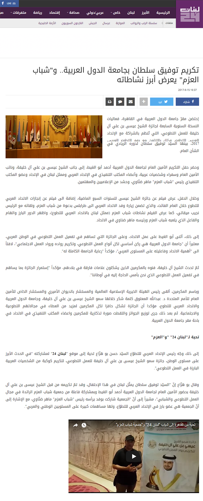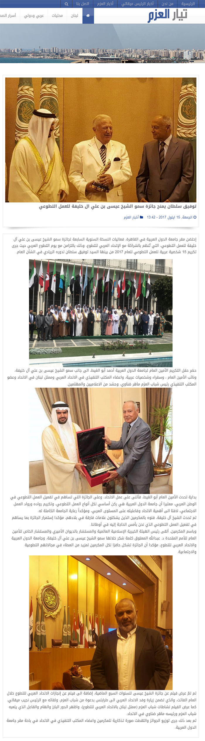 قام سمو الشيخ عيسى بن على بن خليفة آل خليفة الرئيس الفخري لجمعية الكلمة الطيبة والسيد أحمد أبوالغيط الأمين العام لجامعة الدول العربية، صباح اليوم الخميس الموافق 14 سبتمبر 2017 بتكريم رواد العمل التطوعي العربي، الذي حصلوا على جائزة سمو الشيخ عيسى بن علي للعمل التطوعي لعام 2017، وذلك خلال الاحتفالية التي أقيمت في جامعة الدول العربية للمرة الأولى في تاريخ الجائزة.