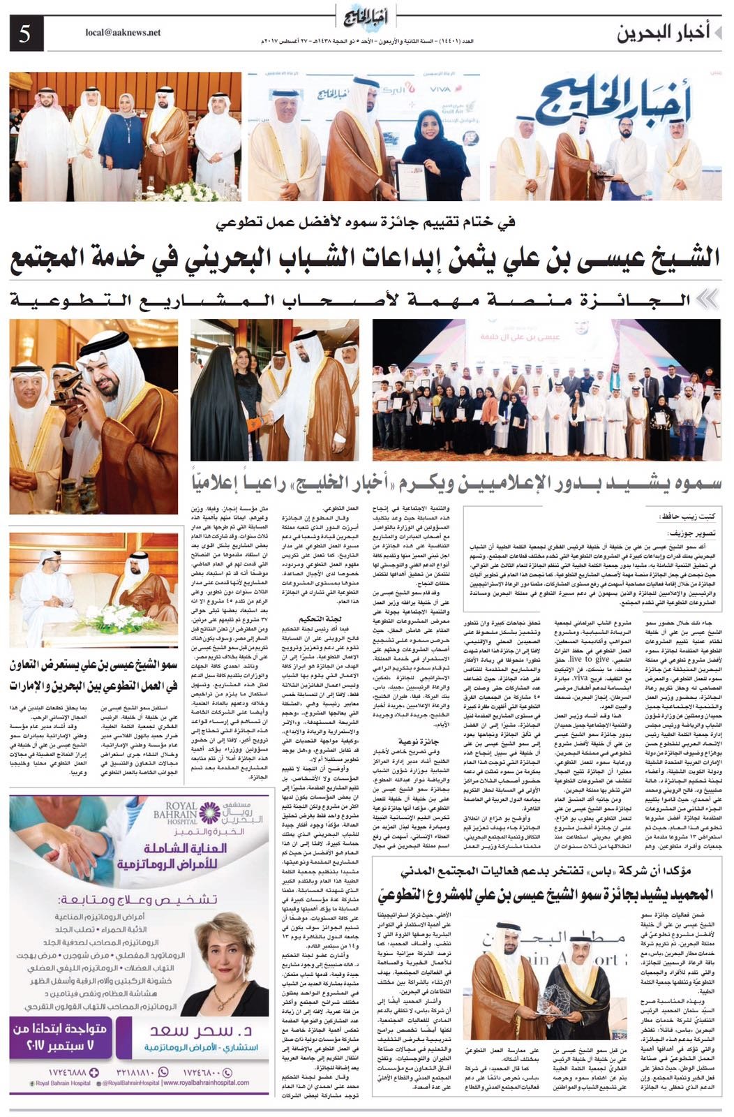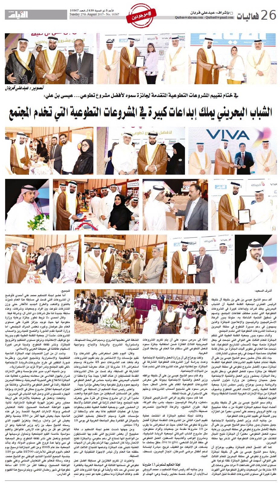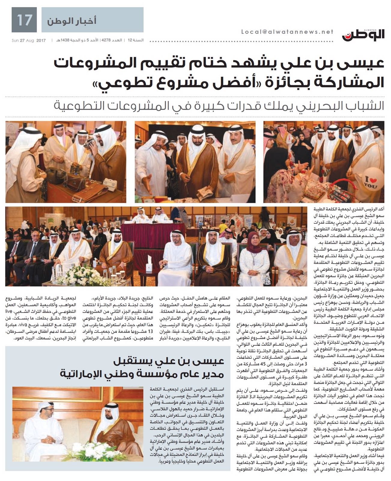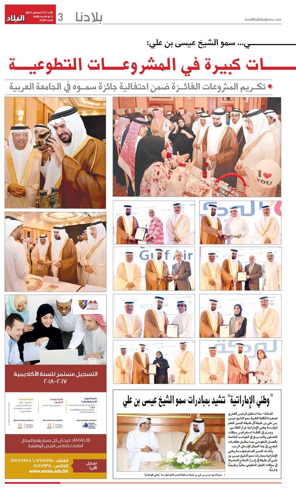 أعلنت اللجنة المنظمة لجائزة سمو الشيخ عيسى بن علي بن خليفة آل خليفة للعمل التطوعي في نسختها السابعة اختيار 15 شخصية عربية كرواد للعمل التطوعي في 2017، تمهيداً لتكريمهم خلال الاحتفالية التي تحتضنها جامعة الدول العربية في الفترة من 13 إلى 15 سبتمبر الجاري، بالتزامن مع يوم التطوع العربي، للمرة الأولى في تاريخ الجائزة.