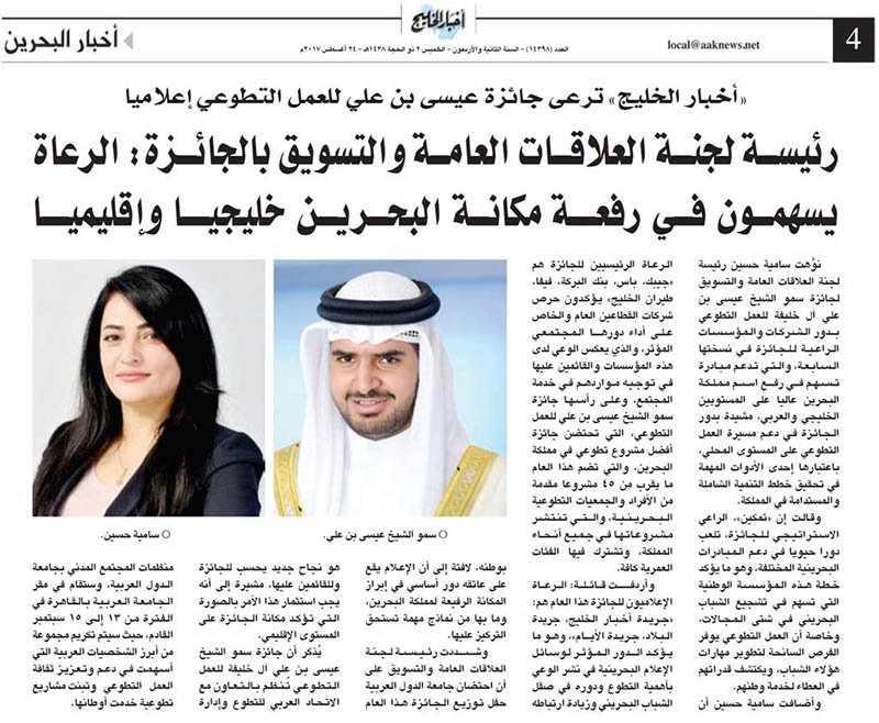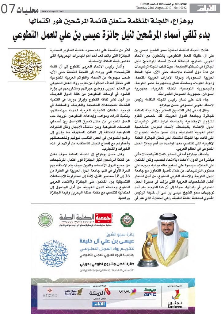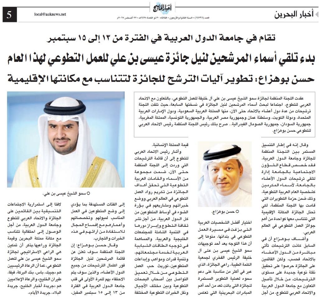 وجدد نائب رئيس الاتحاد العربي للتطوع التأكيد على أن احتضان جامعة الدول العربية للنسخة السابعة من الجائزة ما هو إلا عرفان وتقدير للبصمات الطيبة والمجهودات المباركة لسموه، واعترافا للمرتبة المتميزة التي اكتسبتها الجائزة، بفضل توجيهات القيادة الرشيدة للمملكة وعلى رأسها صاحب الجلالة الملك حمد بن عيسى آل خليفة، وصاحب السمو الملكي الأمير خليفة بن سلمان آل خليفة رئيس الوزراء، وصاحب السمو الملكي الأمير سلمان بن حمد آل خليفة ولي العهد الأمين.