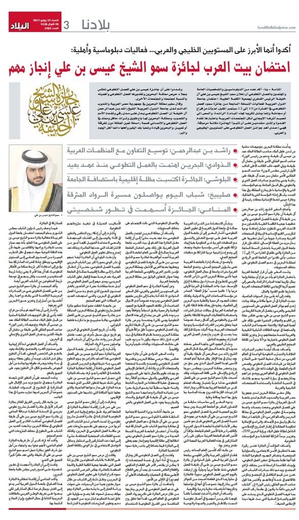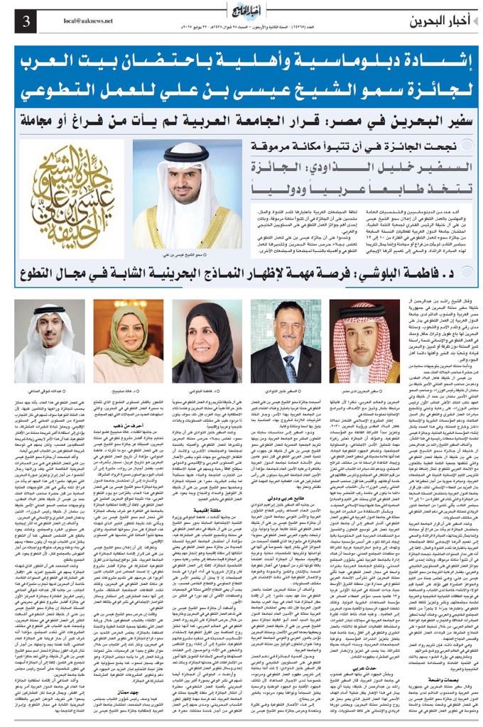 يشار إلى ان النسخة السابعة من جائزة سمو الشيخ عيسى بن علي ال خليفة للعمل التطوعي تستضيفها هذا العام جامعة الدول العربية في مقرها الدائم بالقاهرة في الفترة من 10 إلى 12 سبتمبر المقبل.