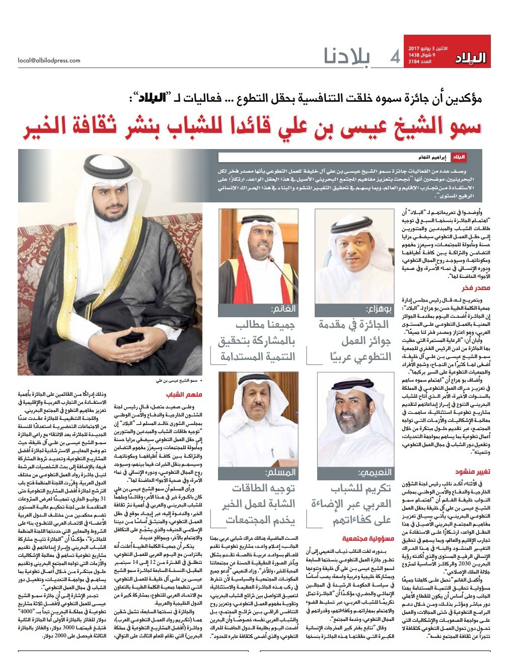 يذكر أن جمعية الكلمة الطيبة أعلنت أنه بالتزامن مع اليوم العربي للعمل التطوعي، تنطلق في الفترة من 12 إلى 14 سبتمبر المقبل، النسخة السابعة لجائزة سمو الشيخ عيسى بن علي آل خليفة للعمل التطوعي، التي تنظمها جمعية الكلمة الطيبة بالتعاون مع الاتحاد العربي للتطوع، بمشاركة كبيرة من الدول الخليجية والعربية.